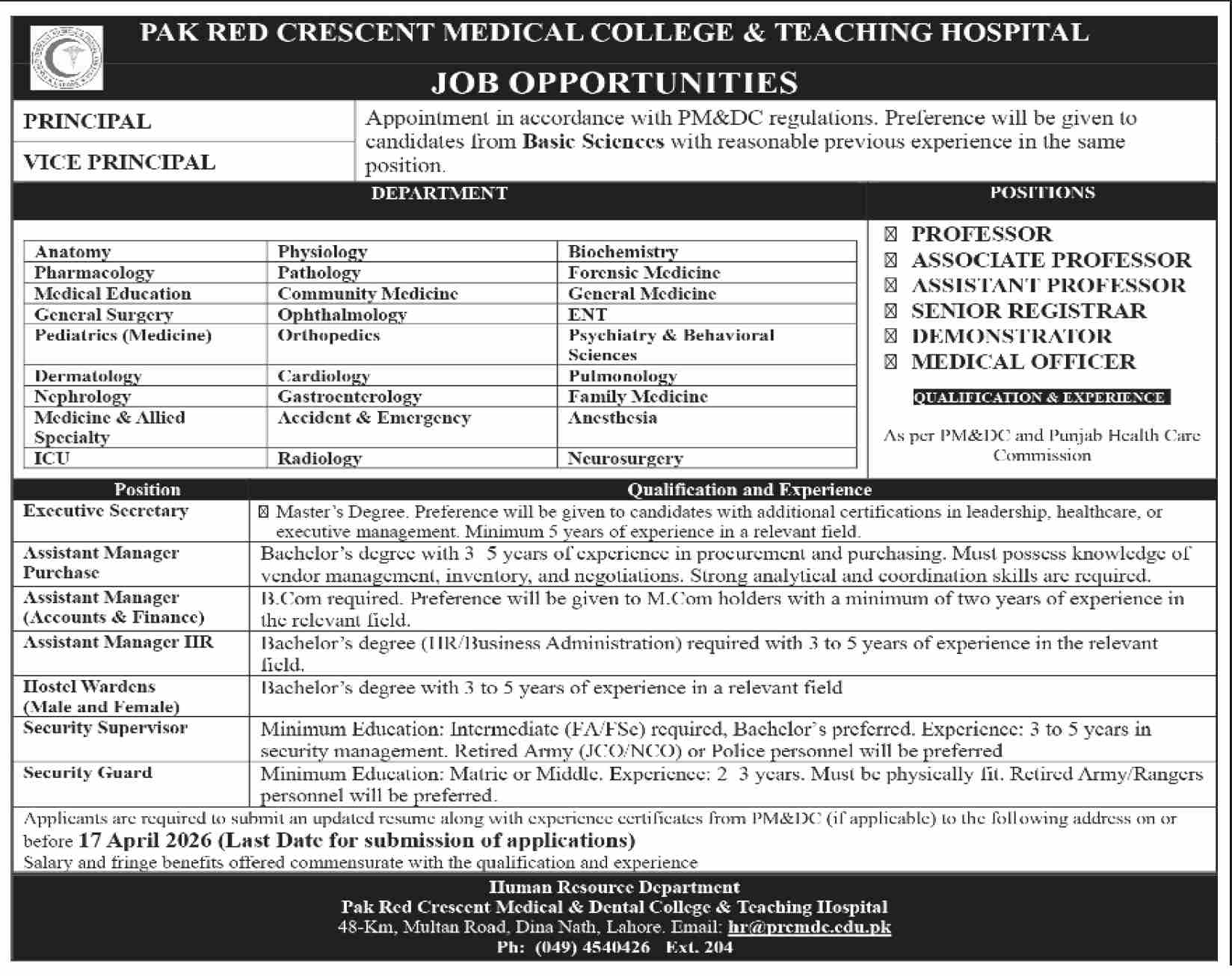 Pak Red Crescent Medical College & Teaching Hospital Jobs 2026 for Teaching & Non-Teaching Staff Job Ad shown on this page is taken from Dawn Newspaper on 10-04-2026