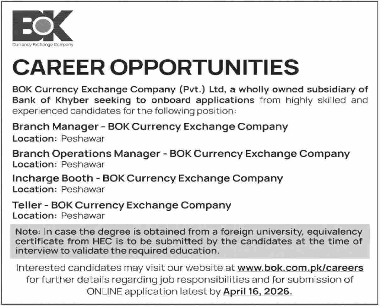 BOK Currency Exchange Company Jobs 2026 Apply Online for Operations Manager, Teller & Others Job Ad shown on this page is taken from Dawn Newspaper on 10-04-2026