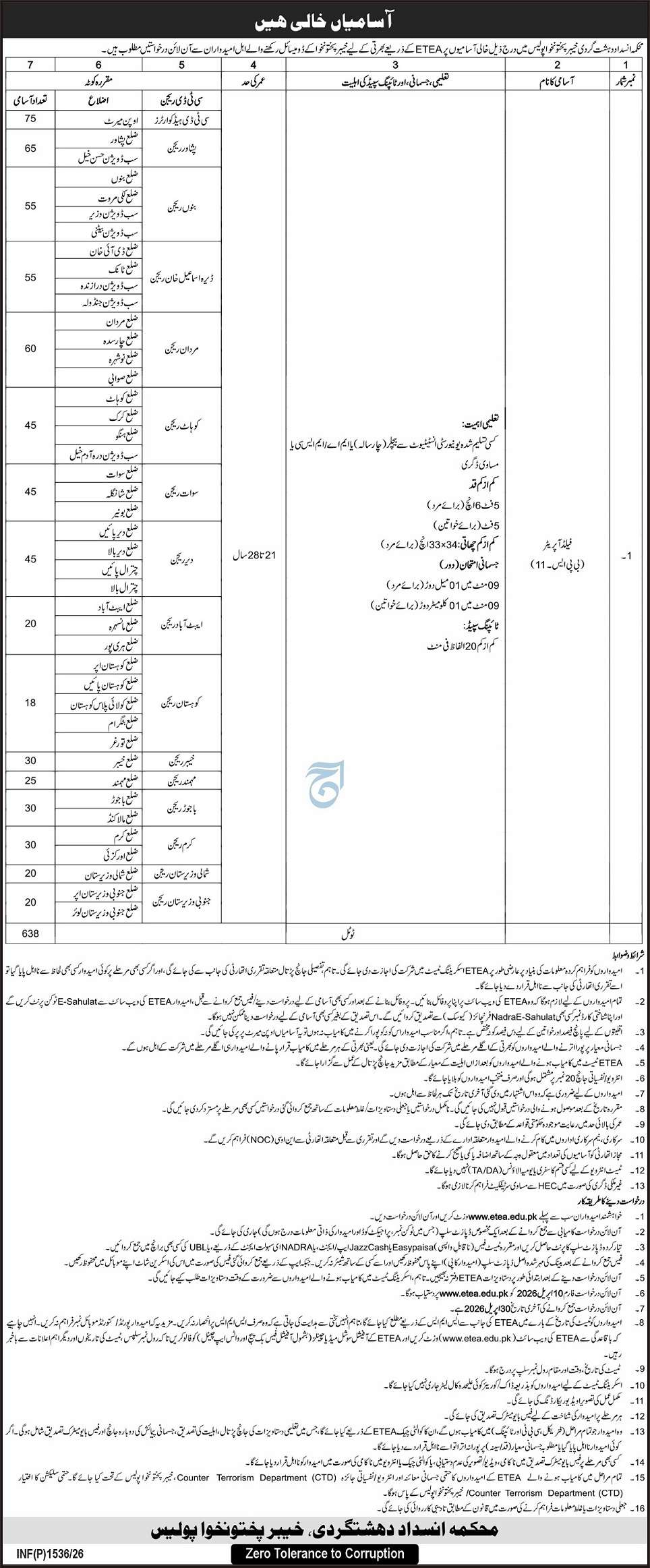 Advertisement of Counter Terrorism Department CTD Jobs 2026 for 638+ Field Operators BS-11 KP Police-296606