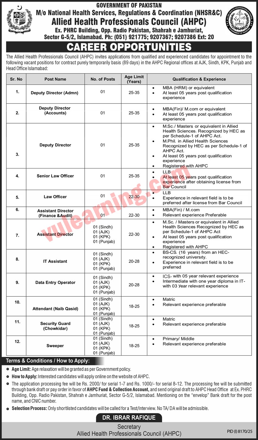 Advertisement of Allied Health Professionals Council AHPC Islamabad Jobs 2026 for Assistant Directors, IT Assistants, Data Entry Opeators, Guards, Naib Qasid & Others-296607