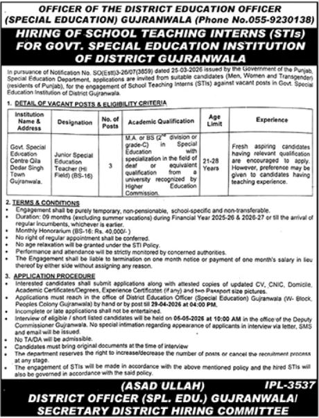 Special Education Department Gujranwala Jobs 2026 for School Teaching Interns (STIs) Job Ad shown on this page is taken from Dunya Newspaper on 11-04-2026