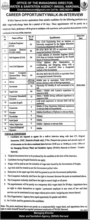 Advertisement of WASA Narowal Jobs 2026 for Sub Engineers, Computer Operators, Sewerman, Surveyor, Naib Qasid & Others Walk-in Interviews-296618