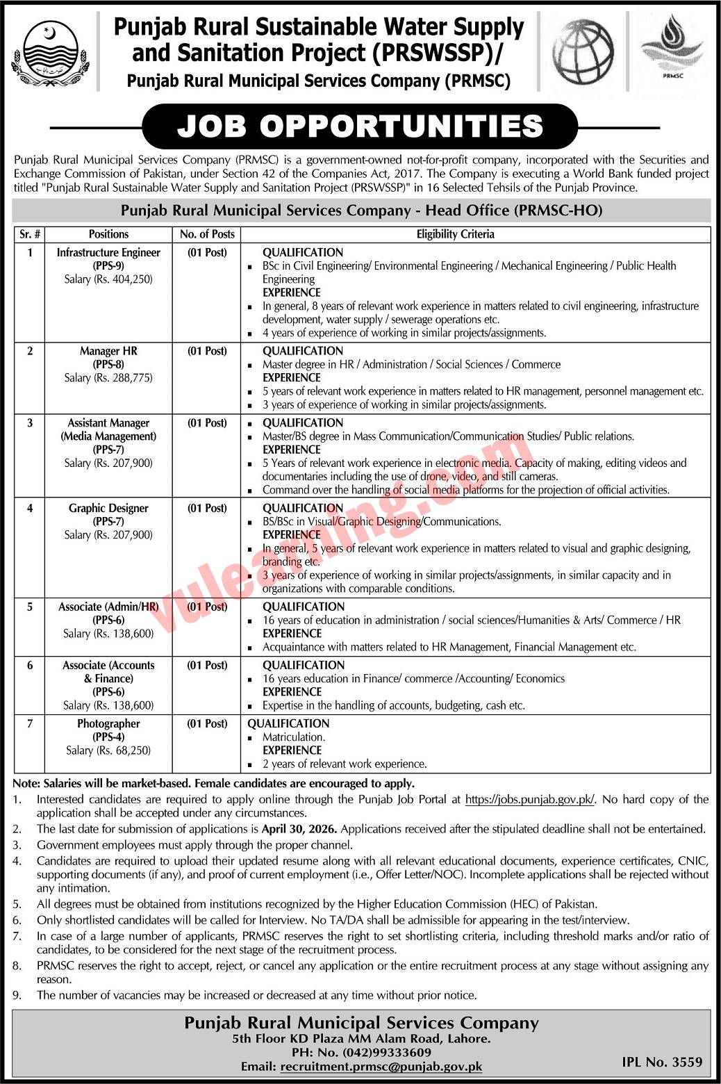 Punjab Rural Municipal Services Company Jobs 2026 PRMSC Apply Online for Punjab Rural Sustainable Water Supply and Sanitation Project (PRSWSSP) Job Ad shown on this page is taken from Express Newspaper on 11-04-2026