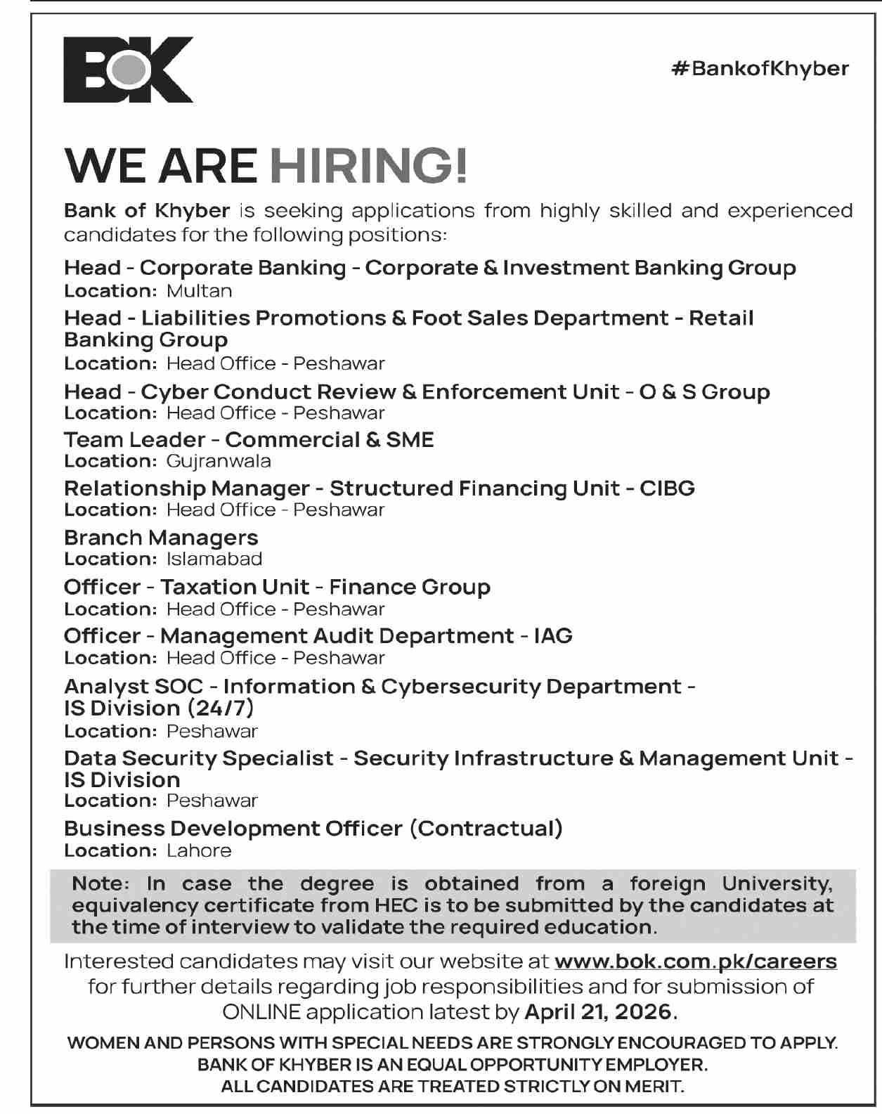 Bank of Khyber Jobs 2026 Apply Online for Relationship / Branch Managers & Others BOK Latest Job Ad shown on this page is taken from Dawn Newspaper on 12-04-2026