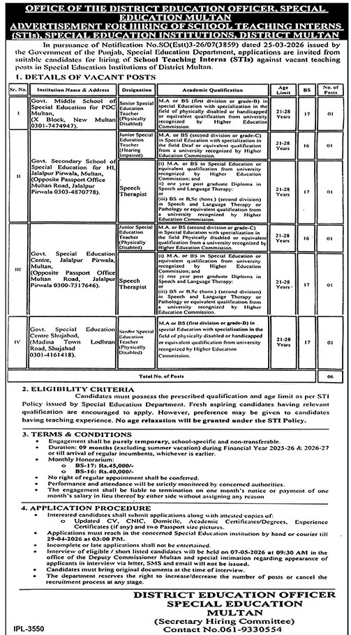 Special Education Department Multan Jobs 2026 for School Teaching Interns STIs Job Ad shown on this page is taken from The News Newspaper on 12-04-2026