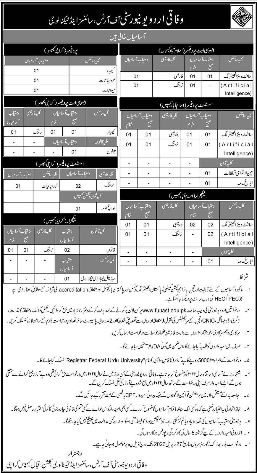 Federal Urdu University of Arts, Science and Technology Jobs 2026 FUUAST Apply Online for Karachi & Islamabad Job Ad shown on this page is taken from Express Newspaper on 12-04-2026