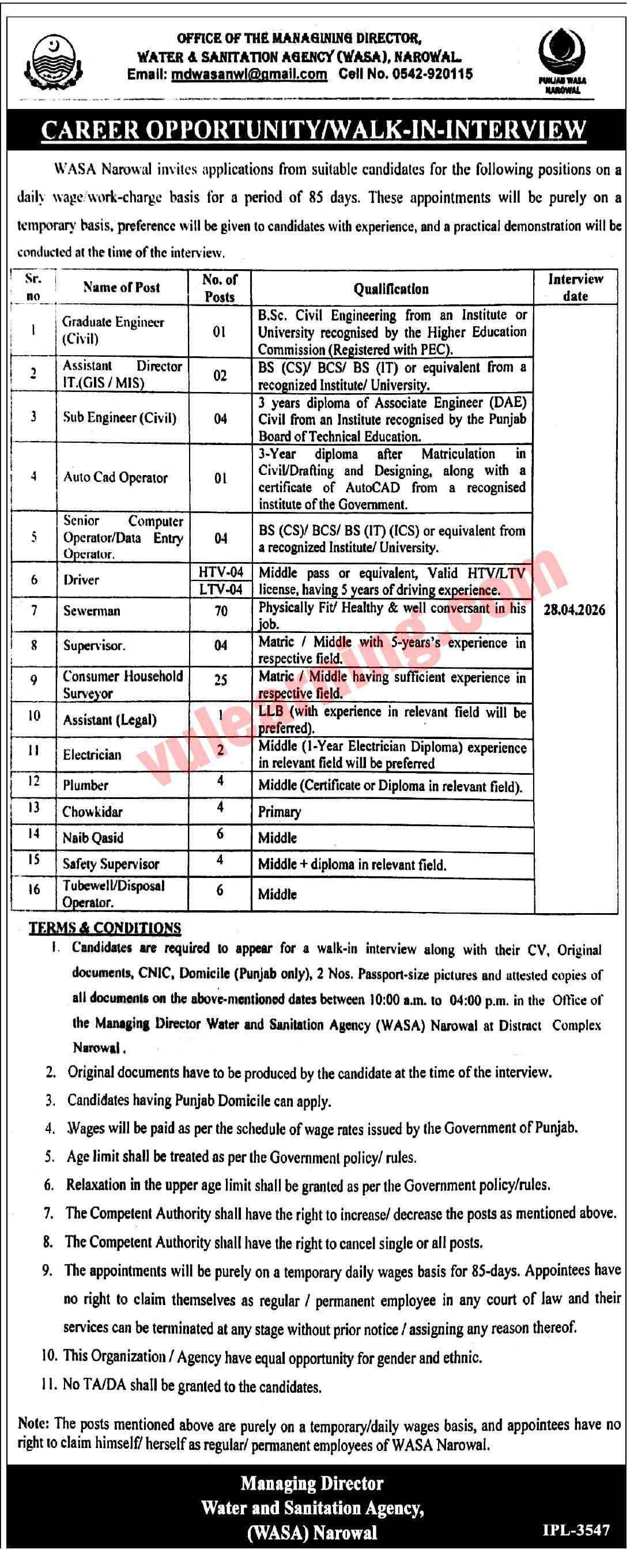 Water & Sanitation Agency (WASA) Narowal Jobs 2026 for Sub Engineers, Computer Operators, Drivers, Supervisors, Naib Qasid & Others Job Ad shown on this page is taken from Express Newspaper on 13-04-2026