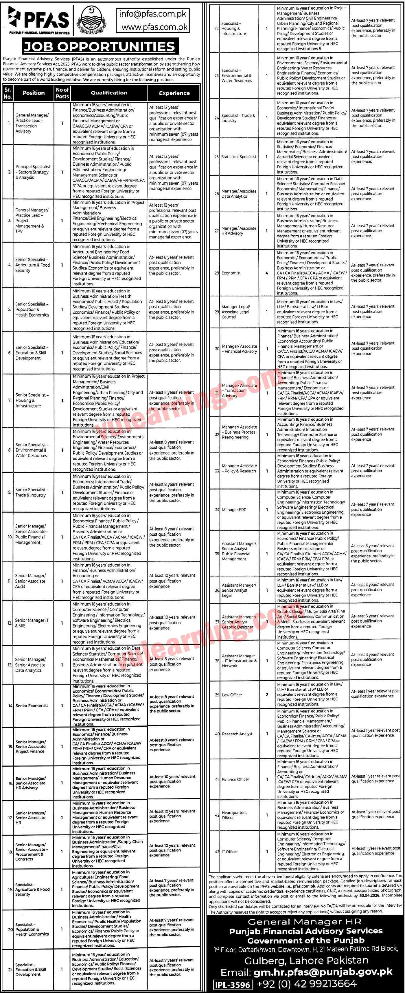 Punjab Financial Advisory Services PFAS Jobs 2026 for Managers, Specialists, Economists & Others Job Ad shown on this page is taken from Express Newspaper on 13-04-2026