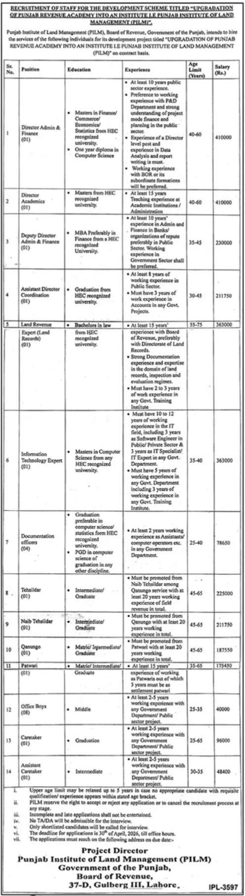 Punjab Institute of Land Management PILM Lahore Jobs 2026 Board of Revenue Punjab Job Ad shown on this page is taken from Jang Newspaper on 14-04-2026