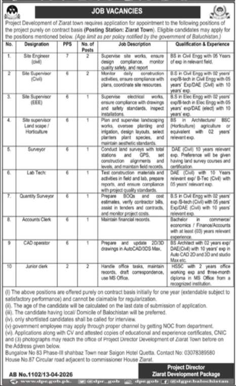 Ziarat Development Package Jobs 2026 for Engineers, Supervisors, Clerks, Surveyor & Others Job Ad shown on this page is taken from Jang Newspaper on 14-04-2026