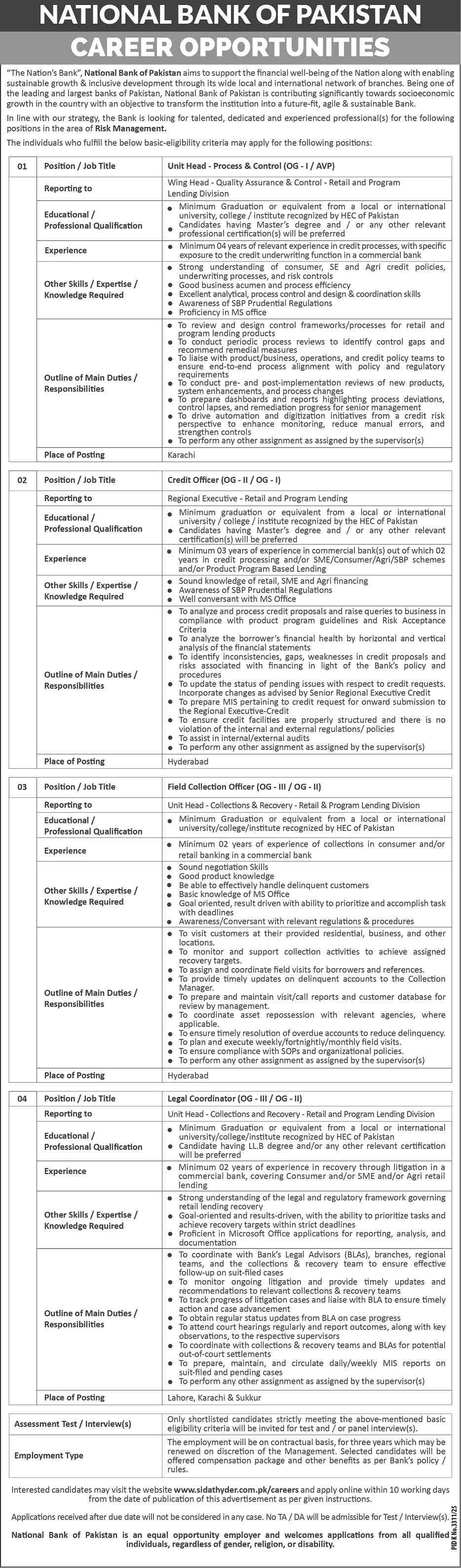 Advertisement of NBP Jobs 2026 Apply Online for Credit Officers, Field Collection Officers, Legal Coordinators & Unit Heads-296689