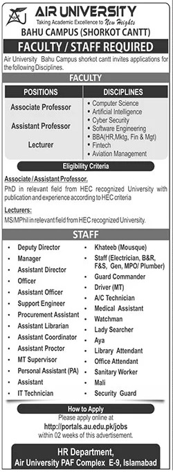 Advertisement of Air University Jobs 2026 Apply Online for Teaching Faculty & Admin Staff Bahu Campus (Shorkot Cantt)-296698
