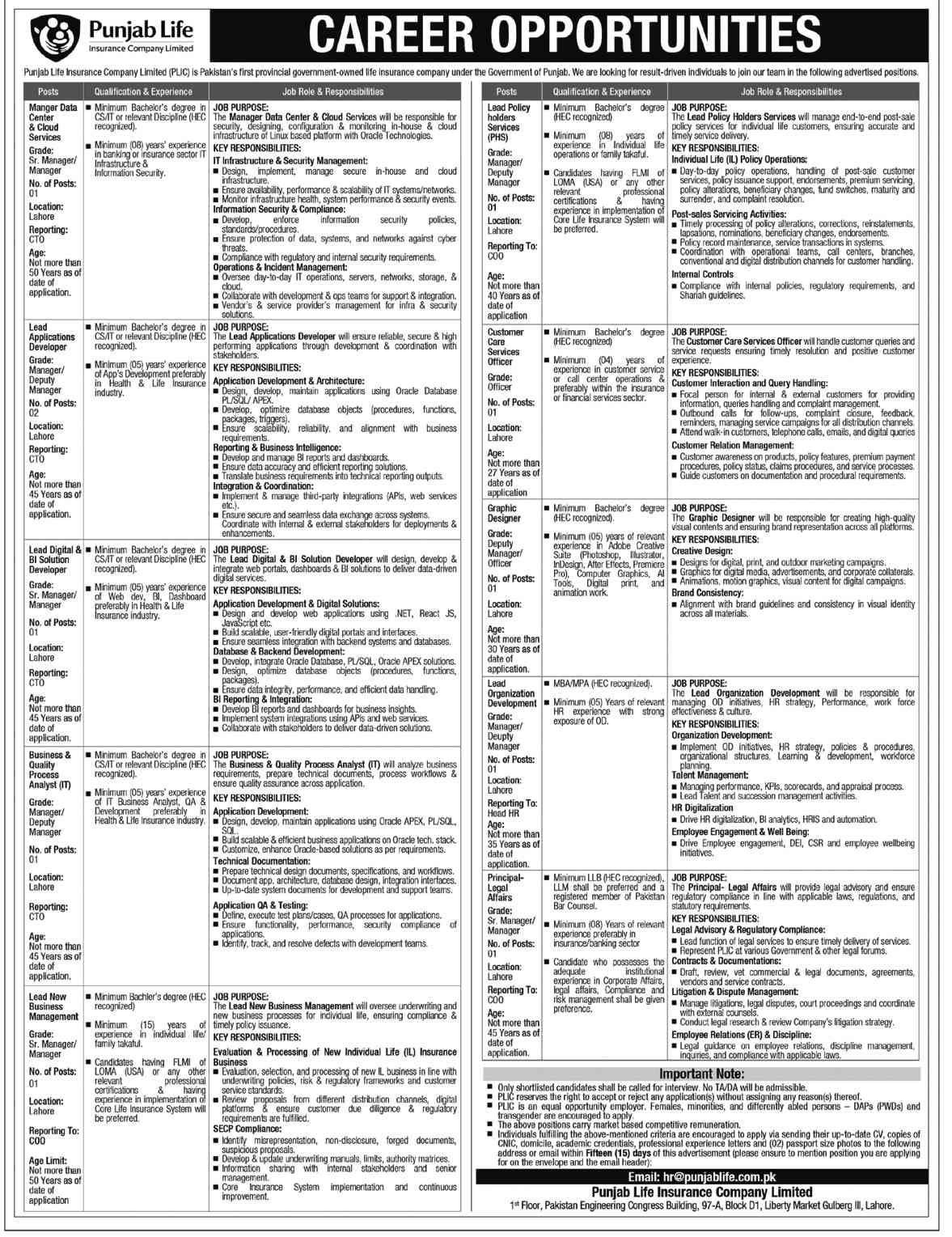 Advertisement of Punjab Life Insurance Company Limited Jobs 2026 Punjab Govt PLIC Career Opportunities-296703