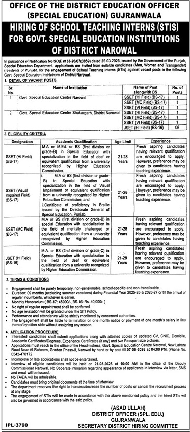 Advertisement of Special Education Department Narowal Jobs 2026 for School Teaching Interns (STIs)-296707
