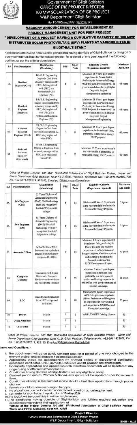 WAPDA Jobs 2026 for Water & Power Department Gilgit Baltistan Solarization Project PMU Job Ad shown on this page is taken from Khabrain Newspaper on 15-04-2026