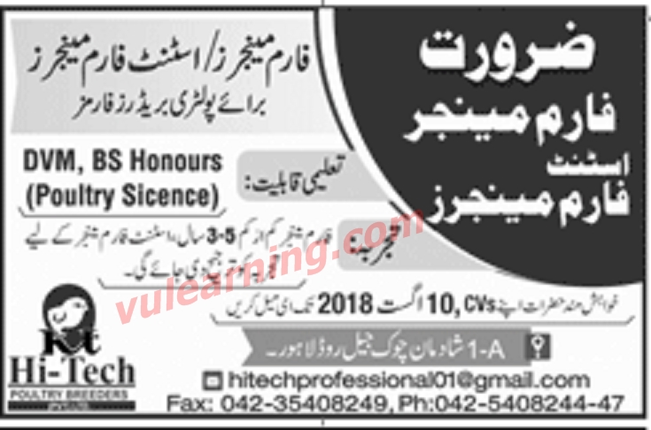 Farm Manager & Assistant Farm Managers Jobs 2018 in Lahore Advertisement Latest Job Ad shown on this page is taken from Jang Newspaper on 03-08-2018