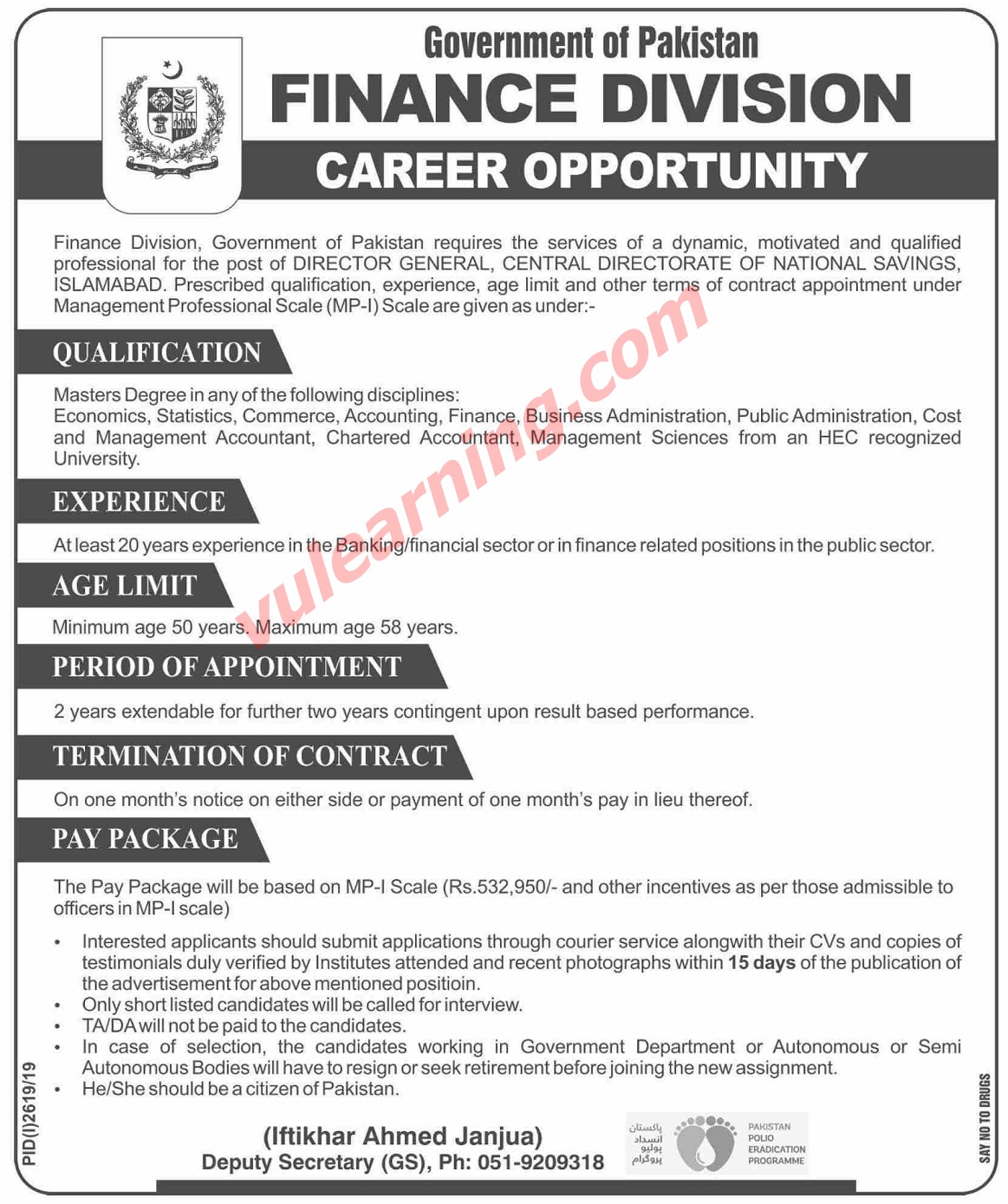 Advertisement of Govt of Pakistan Finance Division Jobs 2019 for Director General of National Savings Islamabad Latest-85701