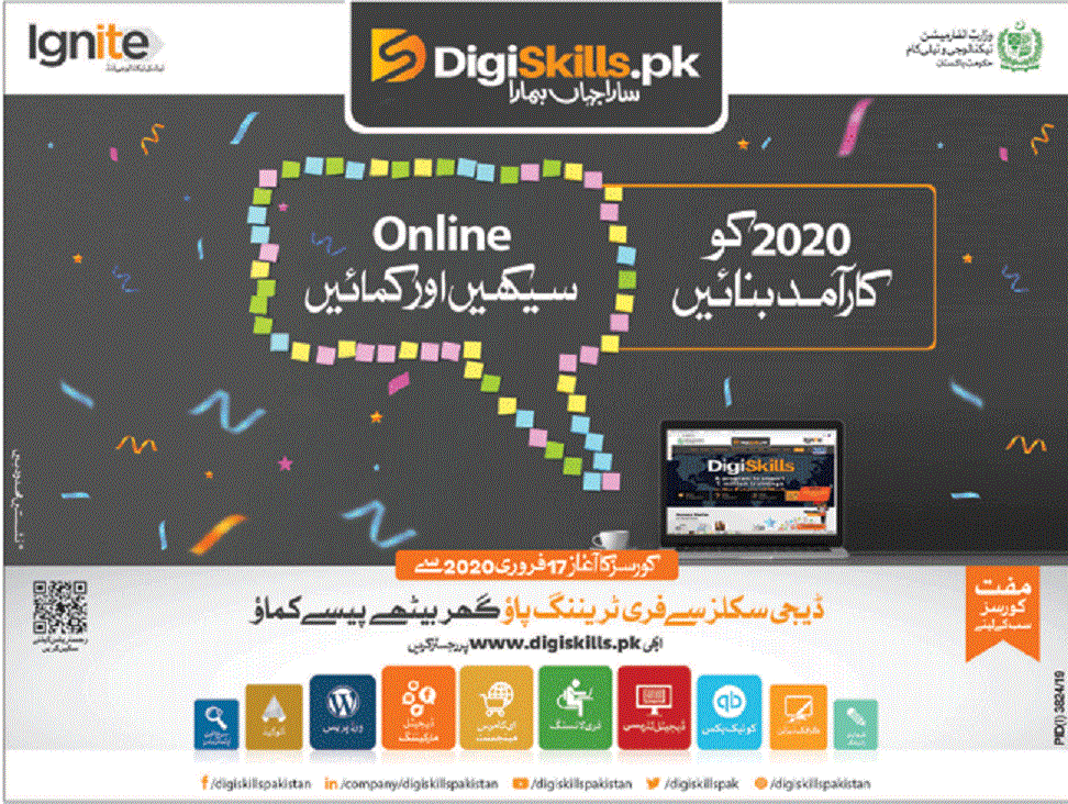 DIGISKILLS Pakistan Training Program 2020 for Free Online Short Courses Apply Online Latest Job Ad shown on this page is taken from Nawa-e-waqt Newspaper on 14-01-2020