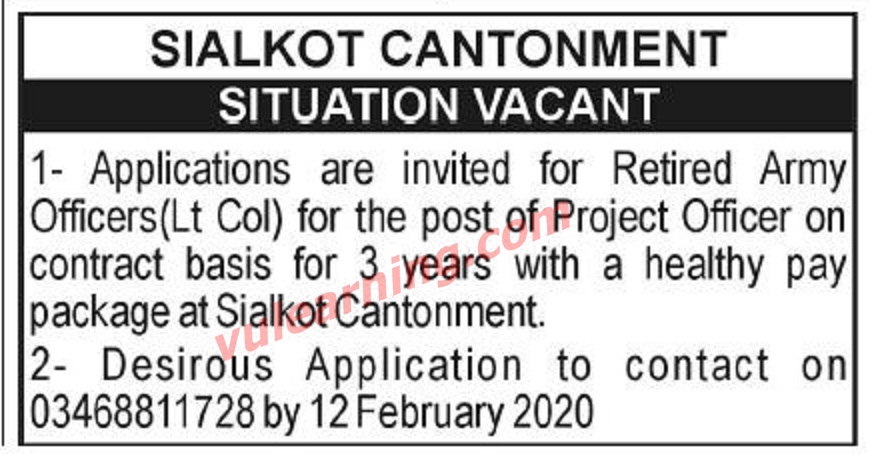 Advertisement of Sialkot Cantonment Jobs 2020 for Retired Army Officers as Project Officer Latest-89304