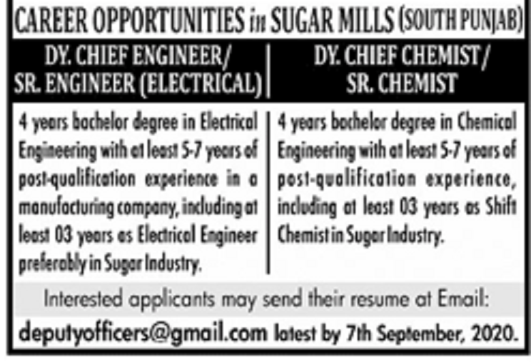Sugar Mill Jobs 2020 for Dy Chief Engineer / Sr. Engineer & Dy. Chief Chemist / Sr. Chemist Latest Job Ad shown on this page is taken from Jang Newspaper on 23-08-2020